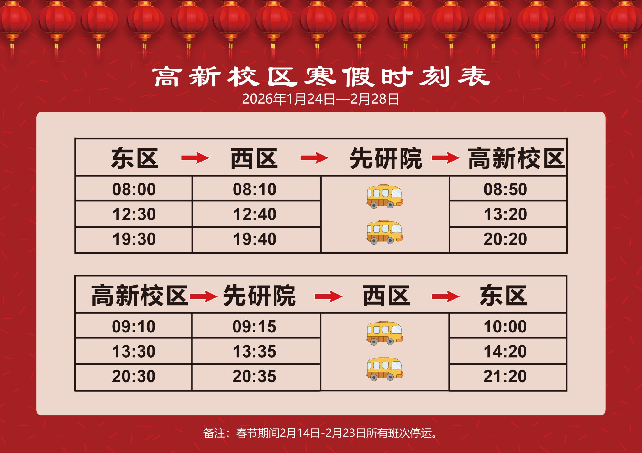 高新校區寒假時刻表(2026年1月24日-2月28日)