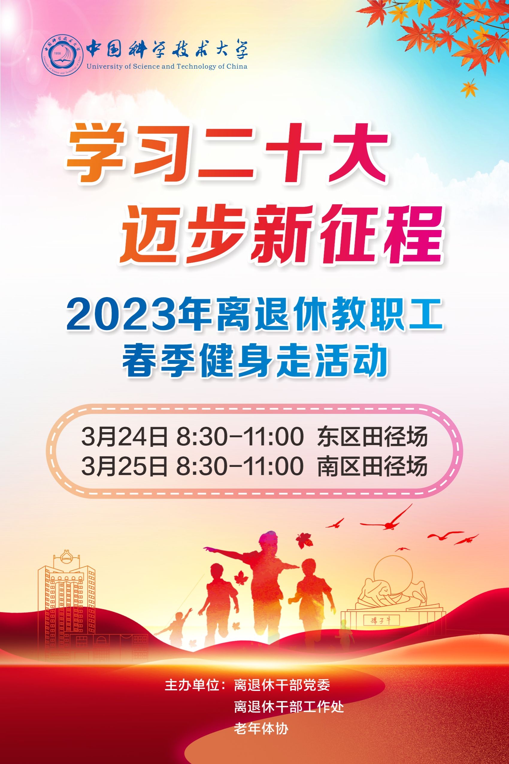 陽春三月,草木權輿。在這春回大地,生機蓬勃的時節,離退休干部黨委、離退休干部工作處與老年體協聯合舉辦的“學習二十大 邁步新征程”2023年離退休教職工春季健身走活動將于3月24日正式開幕。