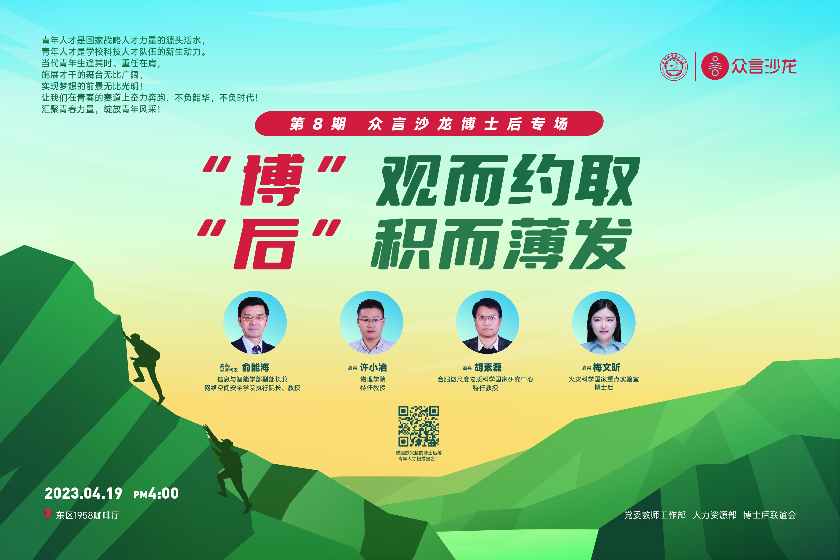 博士后是學校青年科技人才隊伍中的生力軍,第八期“眾言沙龍”活動將以“‘博’觀而約取,‘后’積而薄發”為主題,邀請嘉賓與大家面對面交流。活動將于4月19日(周三)下午4:00在東區1958咖啡廳開展,誠摯歡迎感興趣的博士后等青年人才報名參加!報名鏈接:https://www.wjx.cn/vm/m7QCzS0.aspx#。報名通過者將另行通知,欲報從速。
