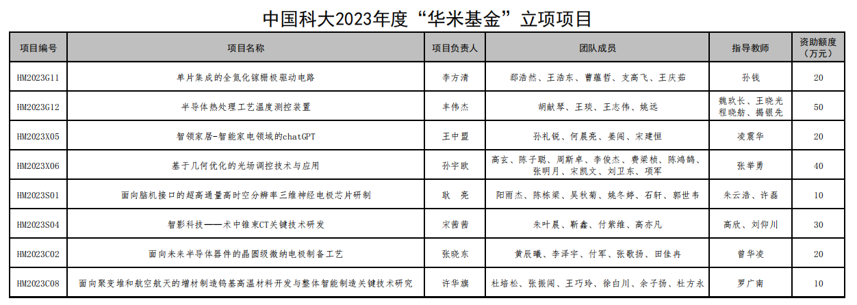 根據(jù)工作安排,中國(guó)科大2023年度“華米創(chuàng)新創(chuàng)業(yè)基金”(以下簡(jiǎn)稱“華米基金”)經(jīng)過(guò)項(xiàng)目申報(bào)、專家評(píng)審、盡職調(diào)查、管理委員會(huì)投票表決、立項(xiàng)公示等環(huán)節(jié),“單片集成的全氮化鎵柵極驅(qū)動(dòng)電路”等8個(gè)項(xiàng)目(詳見(jiàn)下圖,按項(xiàng)目領(lǐng)域及編號(hào)排序)入選2023年度“華米基金”立項(xiàng)項(xiàng)目,予以資助。