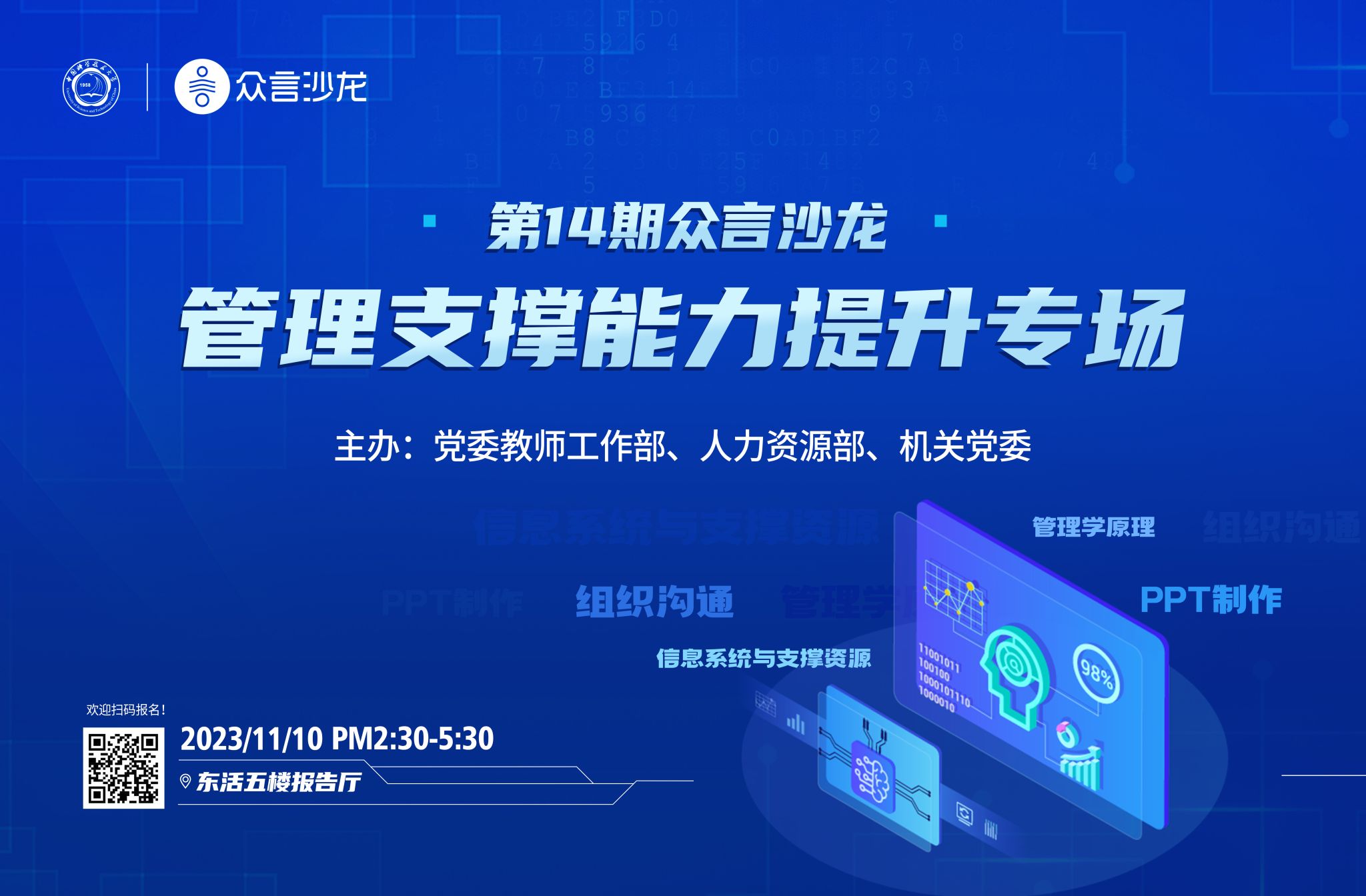 學校的發展建設離不開一支師德高尚、業務精湛、結構合理、充滿活力的高素質專業化教師隊伍。為進一步提升管理崗、支撐崗教師的管理水平和業務能力,加強跨部門合作交流,黨委教師工作部、人力資源部、機關黨委將聯合舉辦第14期眾言沙龍——管理支撐能力提升專場,圍繞管理與溝通、PPT制作技巧、校內信息系統和支撐平臺介紹等方面與大家面對面交流。