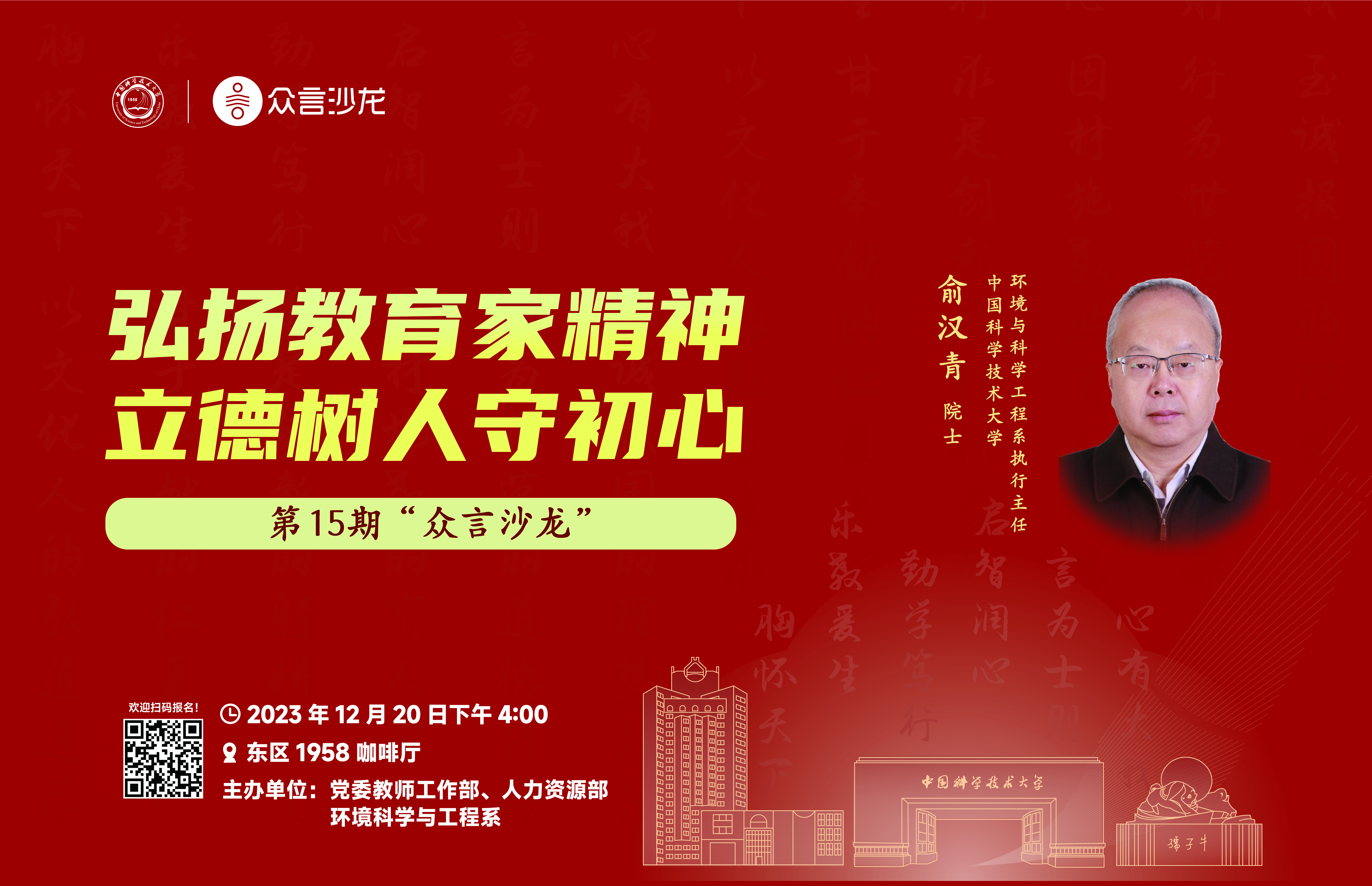 2023年9月9日,習近平總書記致信全國優秀教師代表,深刻闡述教育家精神內涵,并勉勵廣大教師以教育家為榜樣,大力弘揚教育家精神,牢記為黨育人、為國育才的初心使命。長期以來,學校深入貫徹落實習近平總書記的重要指示批示精神,將教育家精神落實落細到教師隊伍建設的具體工作中,堅持講好教育家育人故事。第15期眾言沙龍將以“弘揚教育家精神 立德樹人守初心”為主題, 邀請中國工程院院士俞漢青教授作為嘉賓,與大家面對面交流。