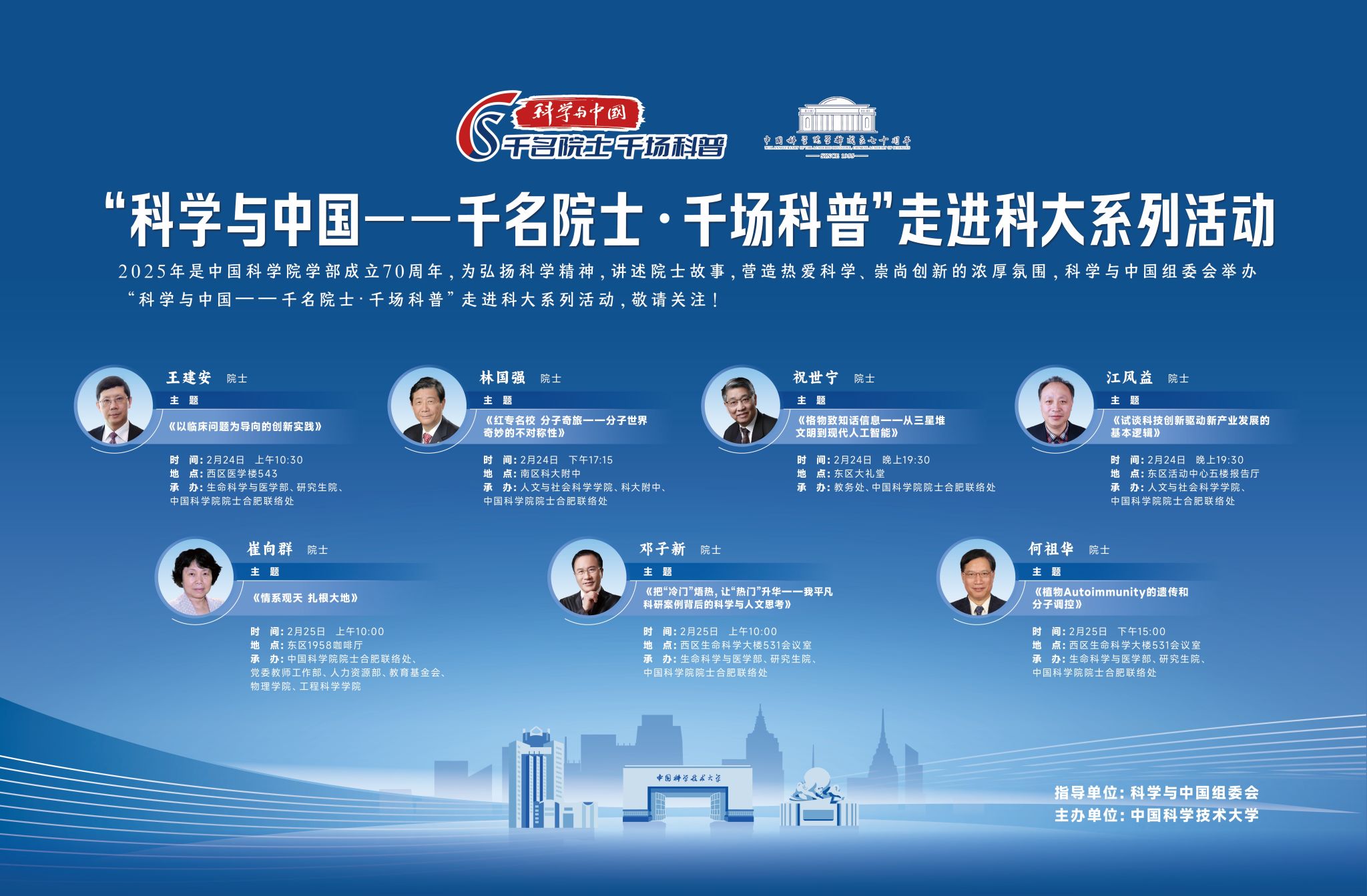 2025年是中國科學院學部成立70周年,為弘揚科學精神,講述院士故事,營造熱愛科學、崇尚創新的濃厚氛圍,科學與中國組委會舉辦“科學與中國——千名院士·千場科普”走進科大系列活動,歡迎感興趣的師生參加!