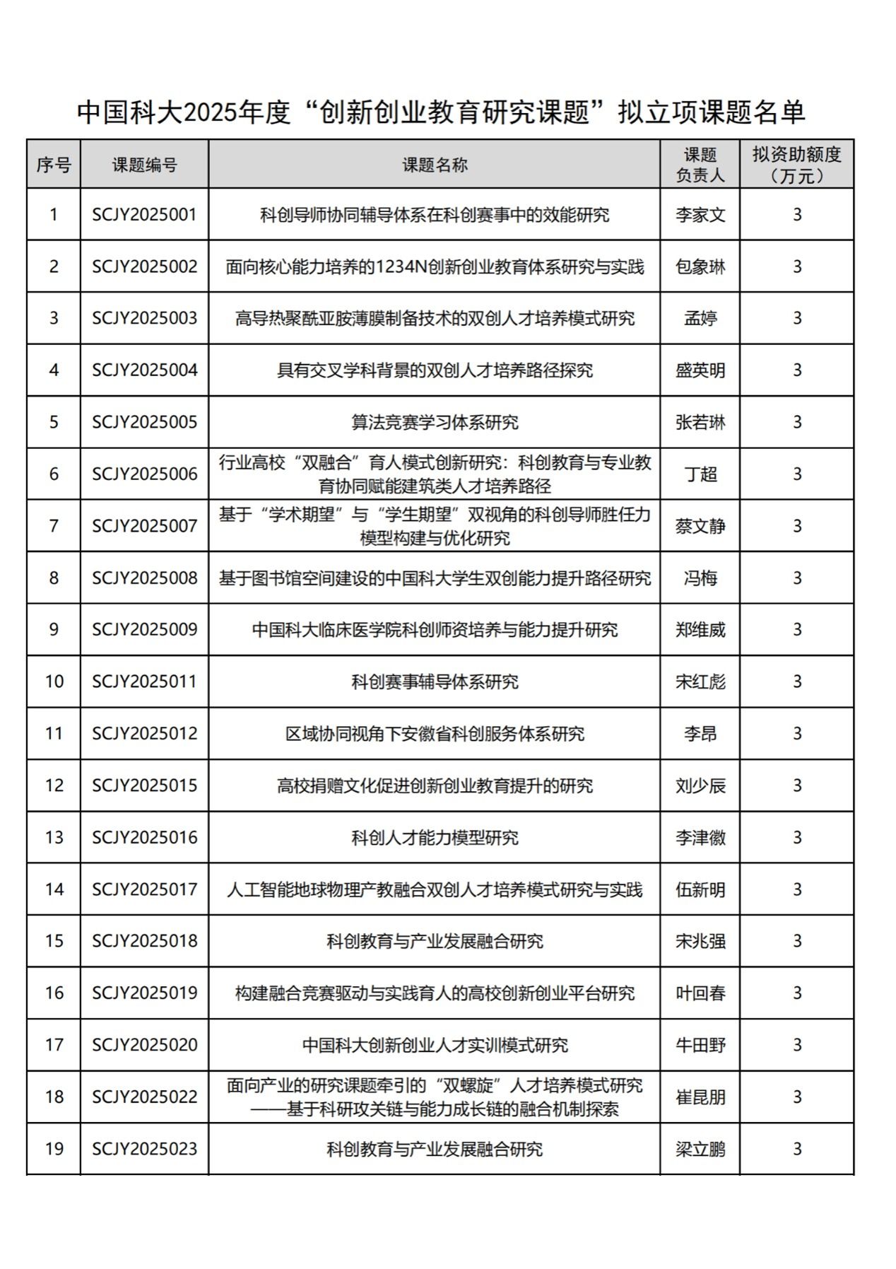 中國科學技術大學2025年度“創新創業教育研究課題”申報評審工作已順利結束,經過課題申報、資格審查、專家評審等環節,確定“科創導師協同輔導體系在科創賽事中的效能研究”等19個課題為我校2025年度“創新創業教育研究課題”擬立項課題,公示如下: